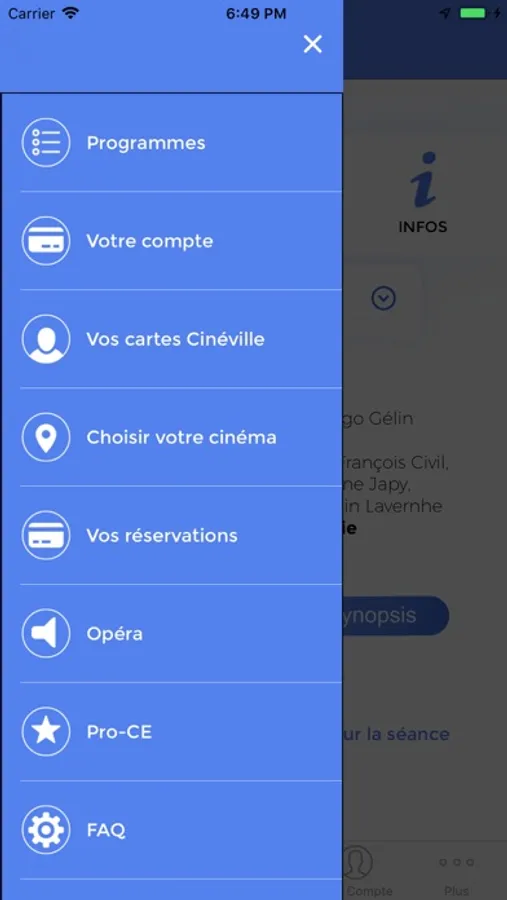 Sélectionnez un cinéma (sur l'onglet Mon Cinéma) pour afficher les films à l'affiche, les horaires des séances, les bandes-annonces etc ...