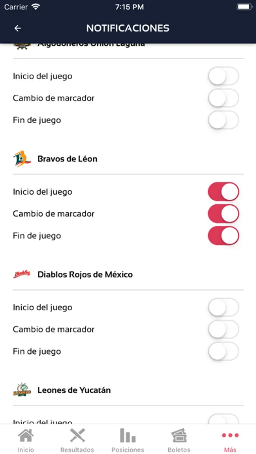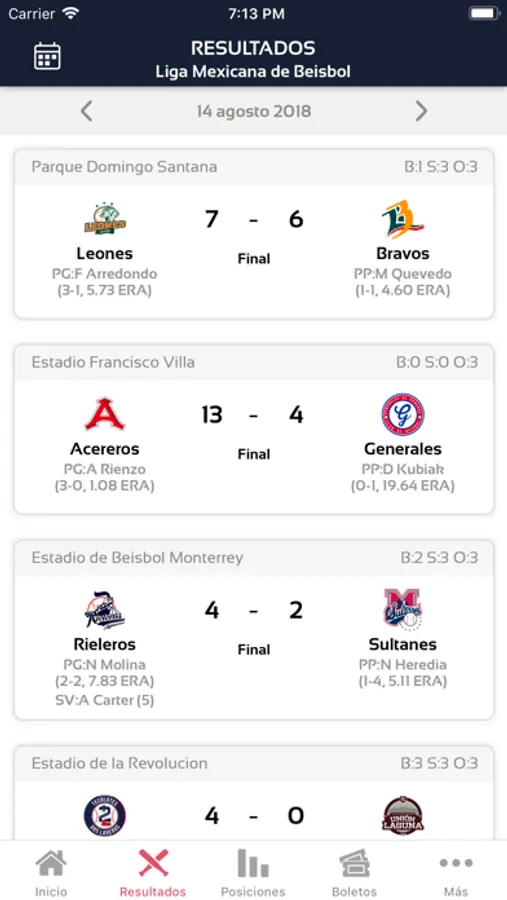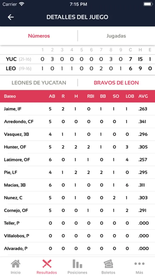 Ver los resultados de cada uno de los juegos de la liga con sus detalles en vivo.