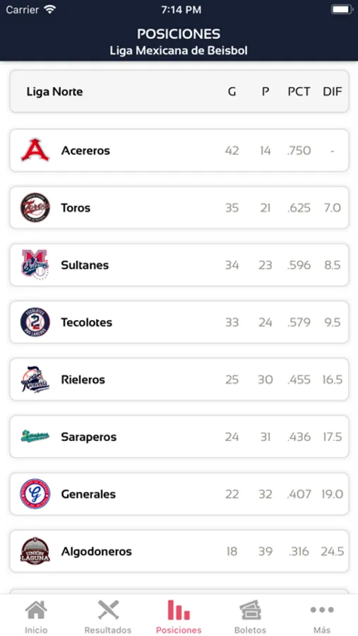 Tabla de posiciones de la liga