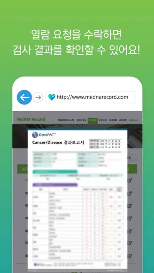 MeDNA는 유전자 질병 예측 검사 결과를 함께 보면서 나의 건강 검진 결과와 비교하여 앞으로 일어날 수 있는 질병을 예측하여 적극예방하고 우리집안에 내려오는 질병을 막기 위해 생활환경을 개선할 수 있도록 나침반 역할을 합니다.