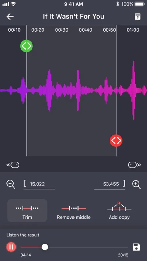 - Edit music, audio with two options: trim (remove left part and right part) or remove middle part. Select parts by setting start & end for the audio clip or using an optional touch interface.