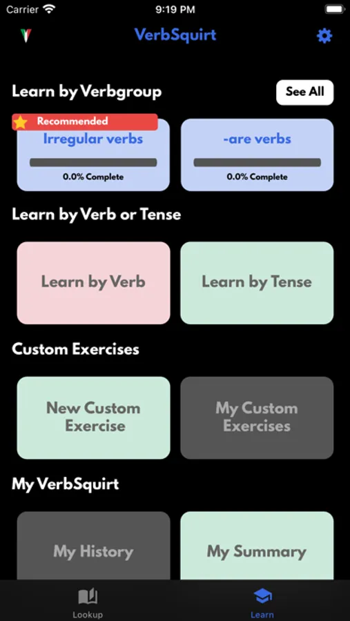 Integrated learning exercises to test your knowledge of the different verbs and tenses and to track your progress