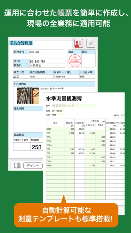・紙の帳票を見た目そのまま現場で作成可能、持ち帰り業務を削減