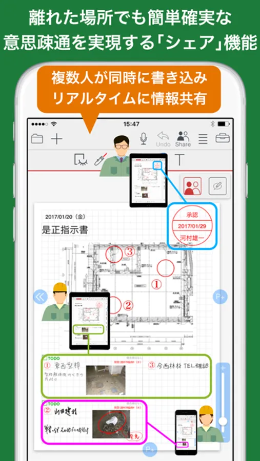 ・現場と事務所など離れた場所でもノートを共有して同時に書き込めます。