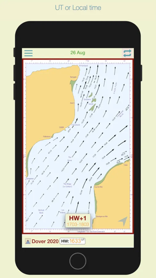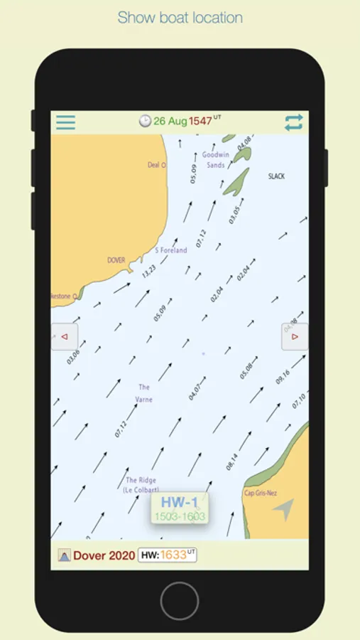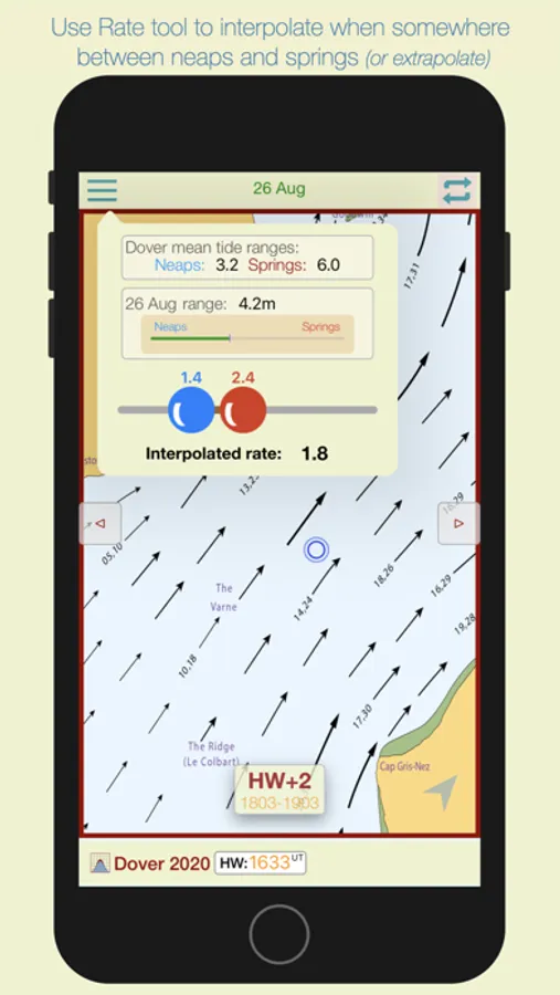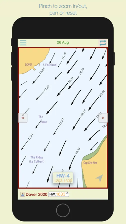 The app automatically selects the nearest Dover HW time of the day, but if you want to see data for the next or previous HW of the day, swipe forward or back to advance the tidal hour.