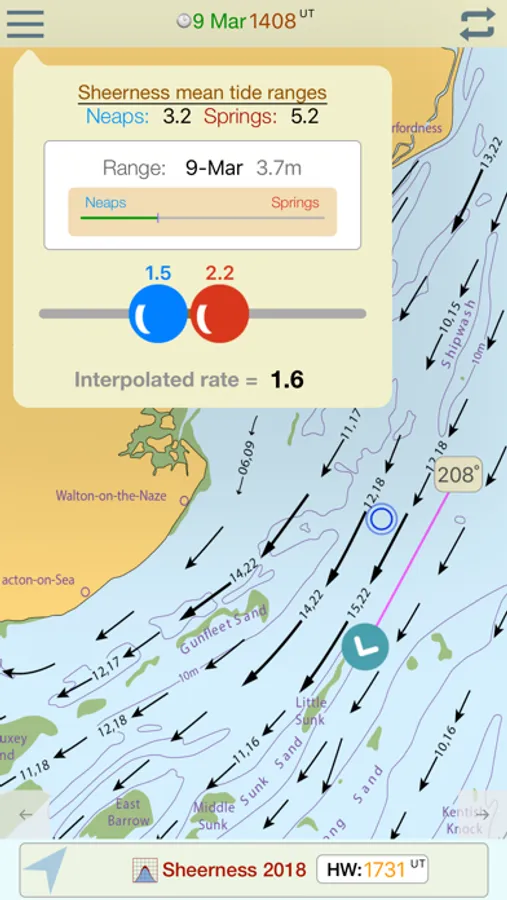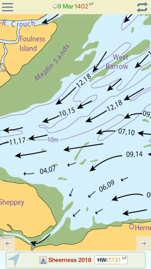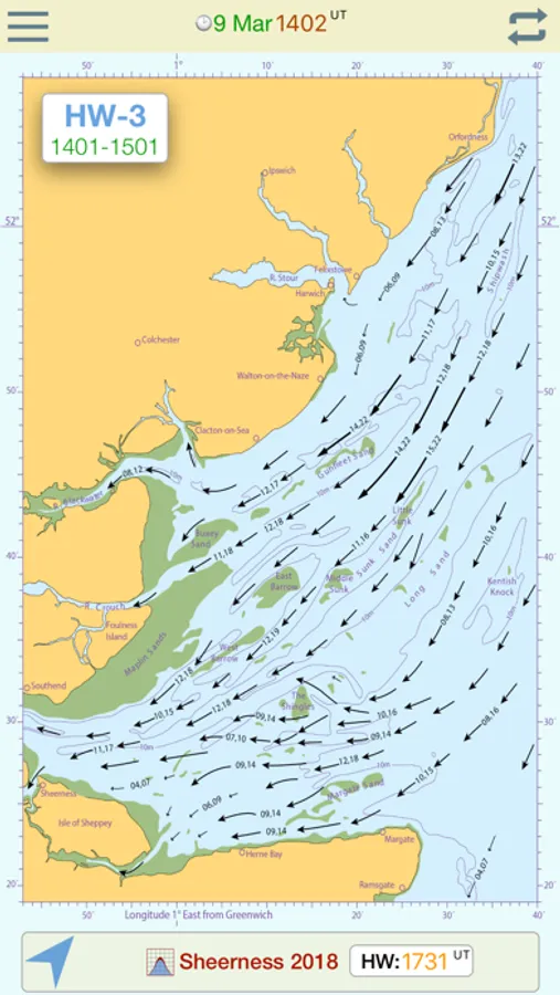 The app automatically selects the nearest Sheerness HW time of the day, but if you want to see data for the next or previous HW of the day, swipe forward or back to advance the tidal hour.