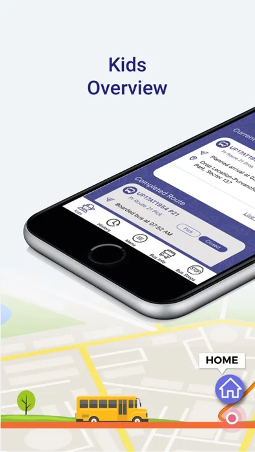 Kids home page will help the parents to get the latest information about the active route or completed route taken by their kids.