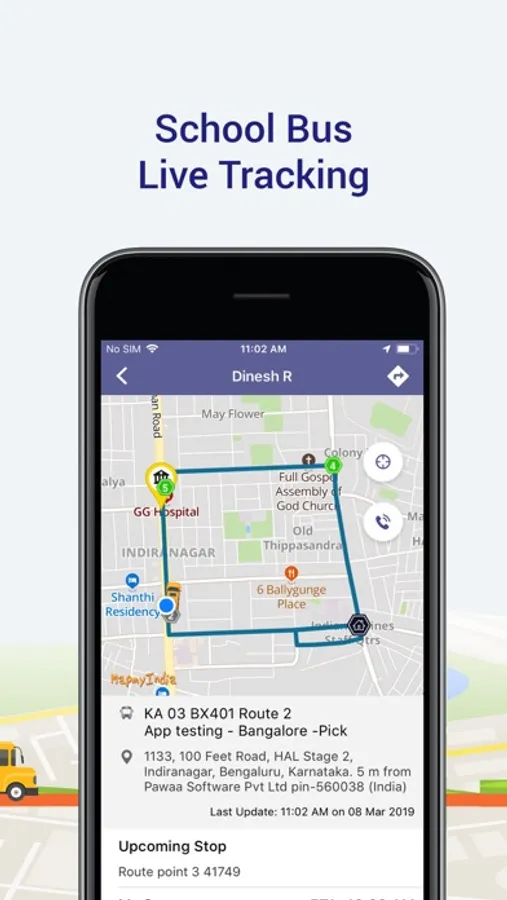 During route active time, live location of the bus along with the upcoming stop details will be provided to the parent.