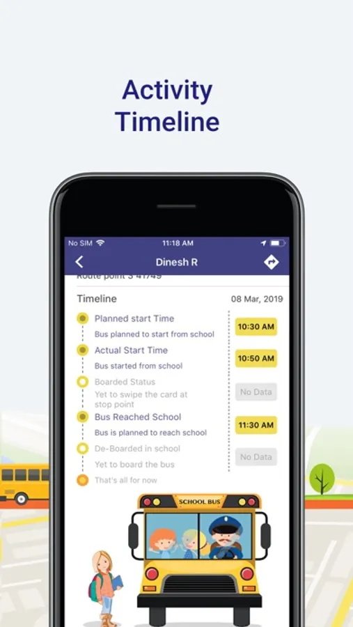 Timeline helps the parent to know the important activity timings such as Planned route start and end time of the bus, the time at which bus left the school, the time of the kids boarding/ deboarding.