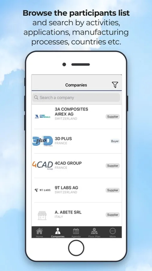 • Browse the participants list and check the companies’ details, search by activities, end- applications, manufacturing processes, countries