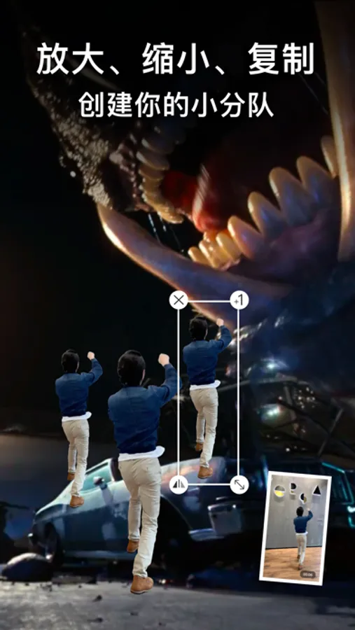 录制视频时,可将自己和他人任意放大、缩小。无限复制自己的分身,一起制作魔性视频