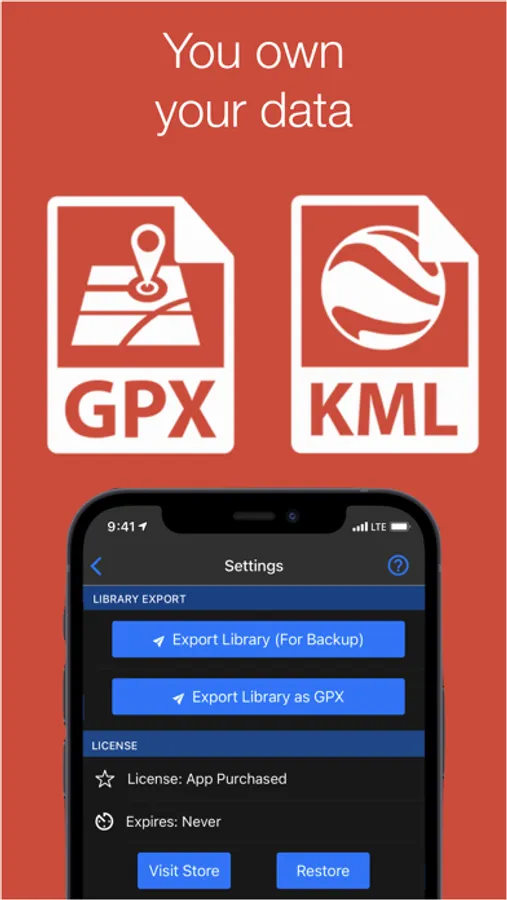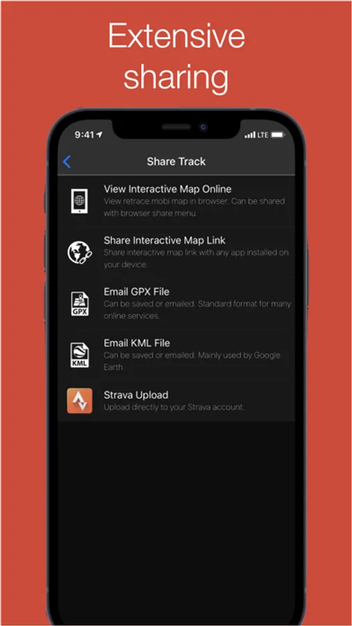 Tracks can also be _imported_ into Retrace using the popular GPX format so that you can follow them on your activities (e.g., you can export a Strava route and import it into Retrace). Your full track library can also be easily exported so it can be migrated to a new device.