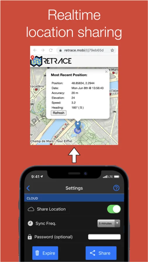 Additionally, Retrace offers optional anonymous online tracking if you wish to upload your current position automatically every few minutes for your loved ones or friends to track your progress. No username is required and you can optionally password-protect your location. An example of the tracking page can be found here: