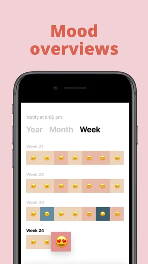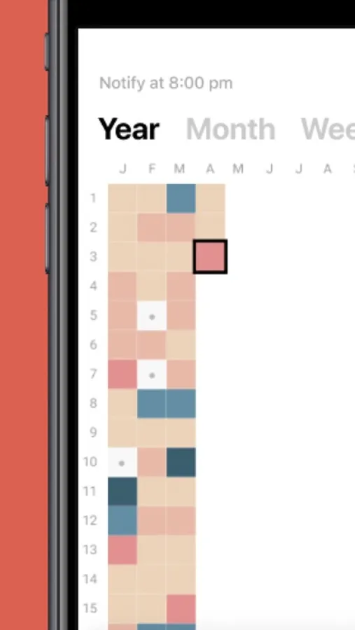 Moodee will help you to keep track of your moods throughout the year. Each day is represented by a pixel and each color represents a different mood.