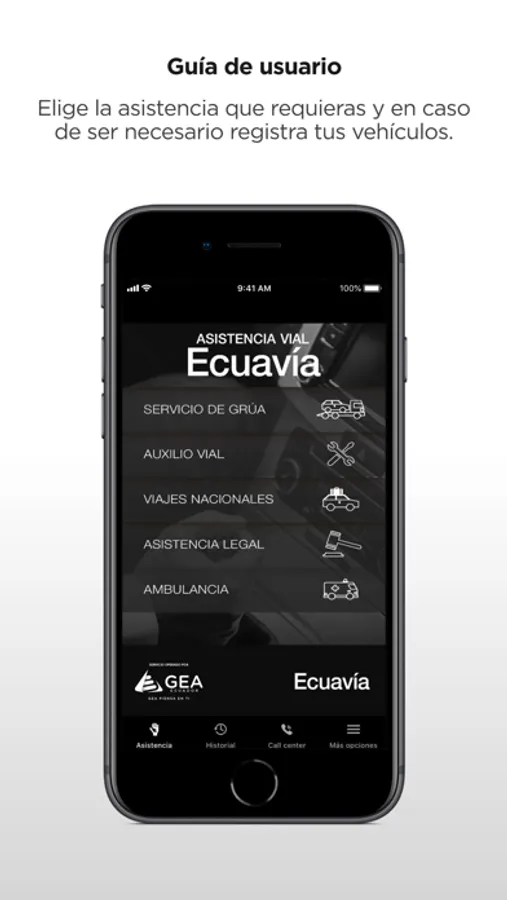 Presentamos la nueva aplicación ECUAVÍA, con la que tendrá al alcance de un click los servicios de asistencia que le ayudarán en sus emergencias las 24 horas del día. Solicite asistencia vial, legal, traslado médico, entre otras. Además podrá revisar el estatus de su solicitud mediante el historial.