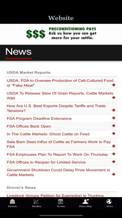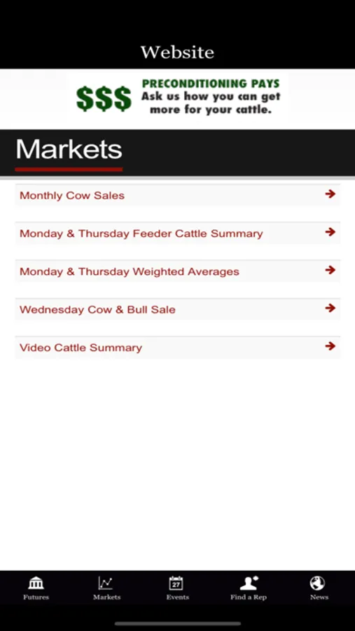 Current Chicago Mercantile Exchange and Chicago Board of Trade futures market reports for live cattle, feeder cattle, corn and soybeans. 10 minute delayed quotes. Market recap reports for Joplin Regional Stockyards feeder cattle and cow and bull auction. Read up-to-date news from USDA and Drovers CattleNetwork, get Joplin Regional Stockyards’ calendar of events, and locate a JRS representative to serve your cattle marketing needs all from your phone.