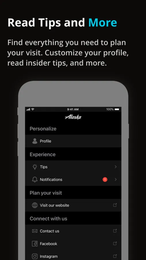 More: Customize your profile, find travel tips, find links to detailed information about our accessibility services, connect to our social media, share feedback, and rate our app.