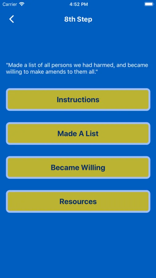 • 8th Step: Prompt lists, option to list “harms done”, decide on timing of the amends, and a special “became willing” button with additional AA “willingness resources” from AA literature.