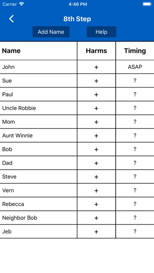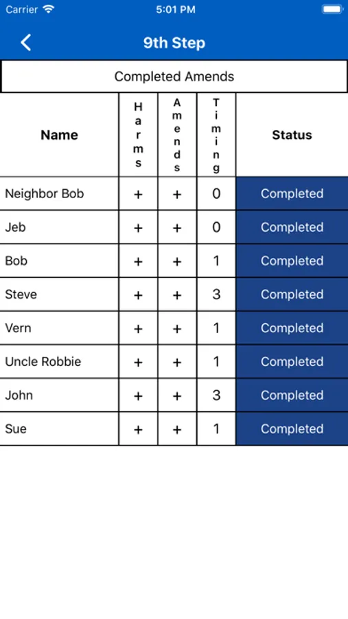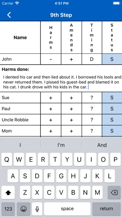 • 9th Step: Allows you to review or edit “harms done”, record what the amends will be, and choose a status (ie: scheduled, completed etc..). Sort 8th Step list by name, amends timing, or amends status. Edit or delete any entry easily.