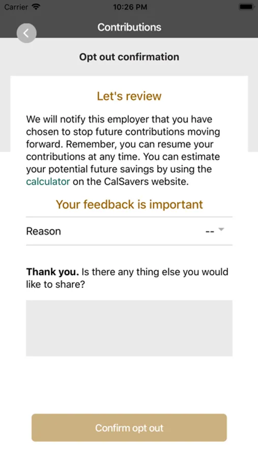 CalSavers is a completely voluntary retirement program. Savers may opt out at any time or reduce or increase the amount of payroll contributions. If a saver opts out they can later opt back into CalSavers. In addition, California law requires that CalSavers conduct an Open Enrollment Period once every two years during which eligible employees that previously opted out of the Program shall be re-invited to participate under automatic enrollment and must opt out again if they still do not wish to participate in the Program.