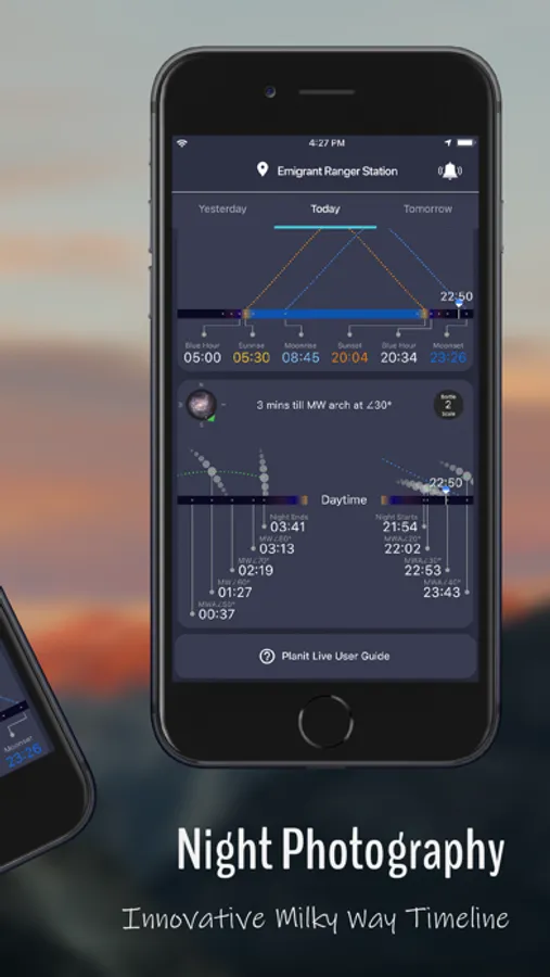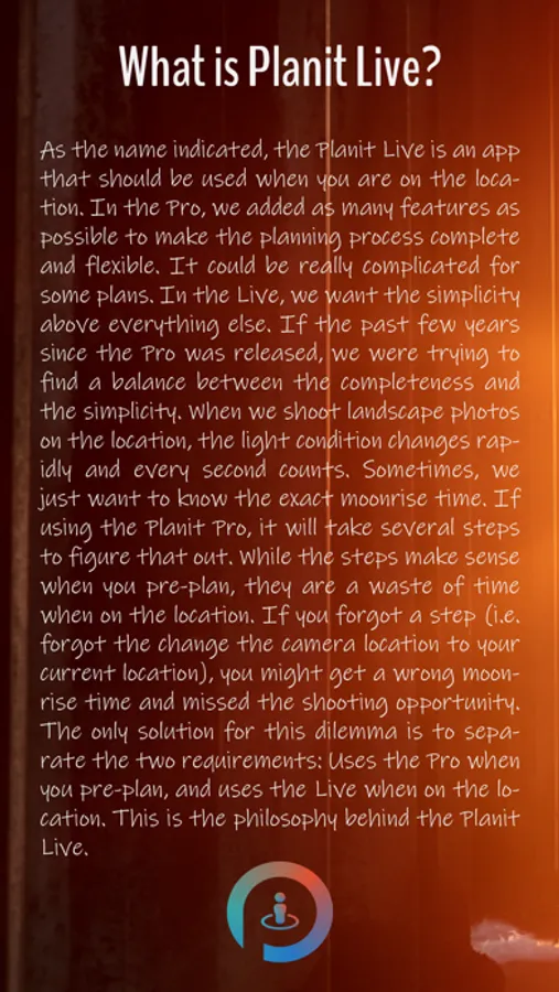 Everyone wants to take great photos. However, many photos look "flat". The main reason for the flatness is because there is no light. Photography is an art of using light. Landscape photography is an art of using nature light. That's why great landscape photographers chase the light to the extreme. They captured the perfect moment when nature light from the Sun, the Moon or the Milky Way and Stars are at the best angle or at the most perfect position. Our another app, Planit Pro, provided a powerful tool for pre-planning these perfect moment. However, when you are on the location, the purpose of using the app is different. That's why we decide to introduce the Planit Live, to provide the best experience for photographers when on the location.