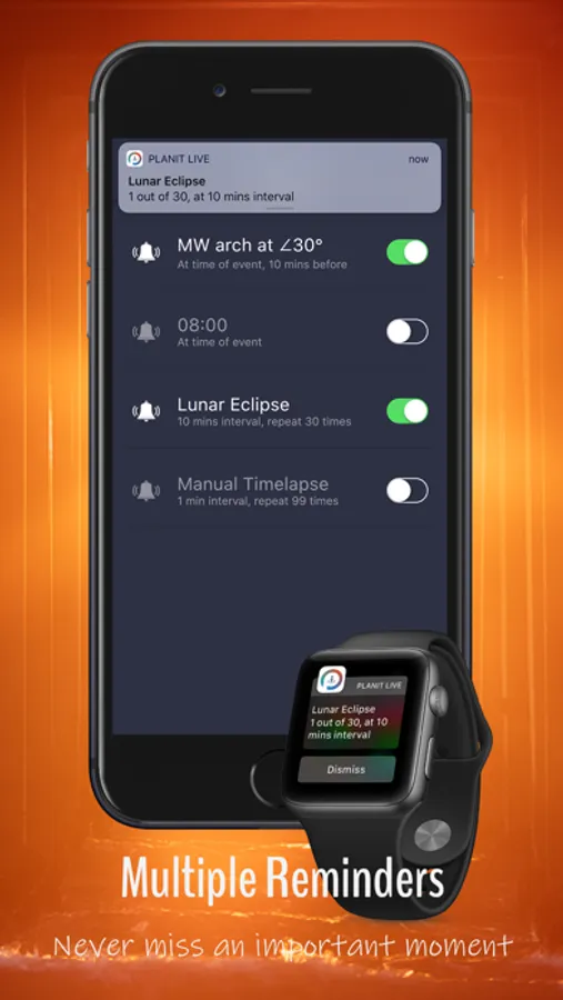 This app is not only for professional photographers. Anyone who has a camera, even a cell phone camera, can benefit from this app. As a matter of fact, even you don’t take photo but just want to witness the beautiful scene because of the ideal nature light, you can use the app too. To make the app simple to use when on the location, we only defined a single user case: You need some information, so you take out the phone, open the Planit Live, get the the information right away and close the phone. The whole process will only last for a few seconds. In most cases, you don't even need to click anything in order to get the information they are looking for. We also provided a reminder feature. You can setup the reminders before heading out. The app will remind you when the time is due so that you don't miss these important moments. If you wear an Apple watch that paired with the phone, you will see the reminder on the watch too.
