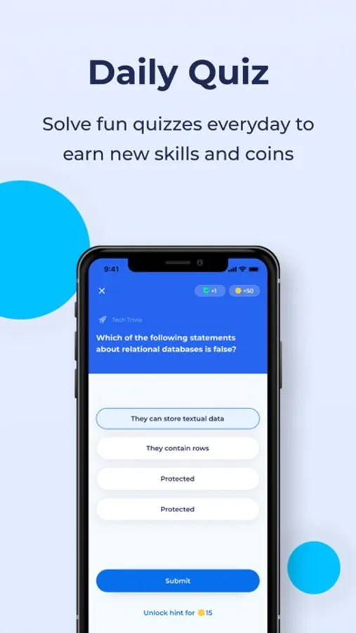 - Daily quizzes across 5 topics - Math, Coding, Logic, Tech Trivia and English