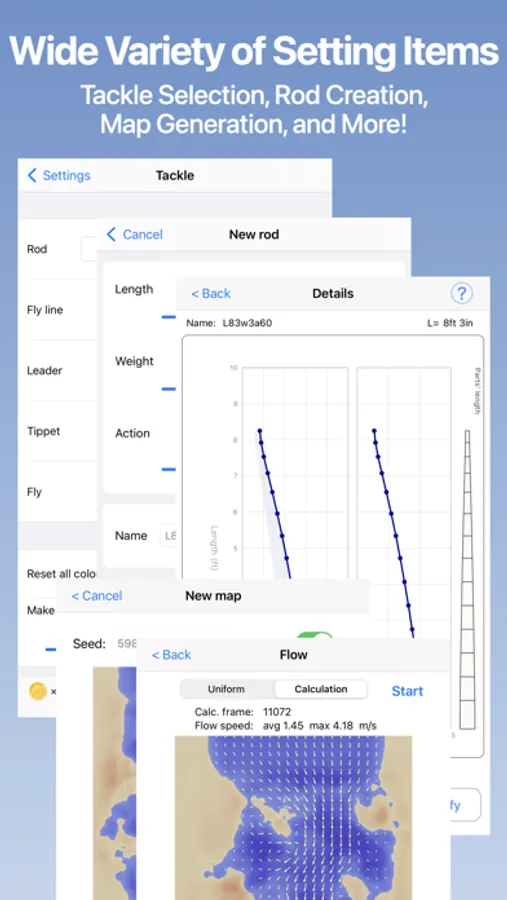 • You can change various conditions at will. Tackle selection, rod creation and editing, river maps, current, wind, fish cautiousness and fish visibility, and more!