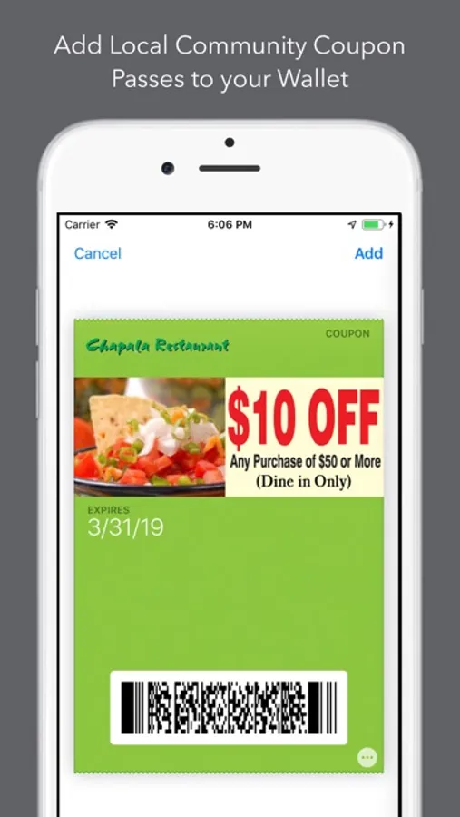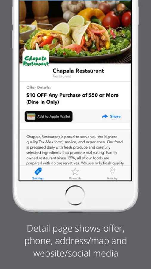 The Coupons and Rewards Cards you save appear automatically on your lock screen when you enter the merchant's business. Redeem your coupons and earn rewards points right from your phone. Simply tap 'Save offer' and 'ADD' it to your Apple Wallet.