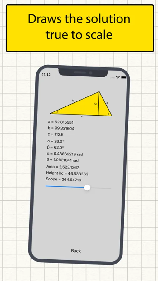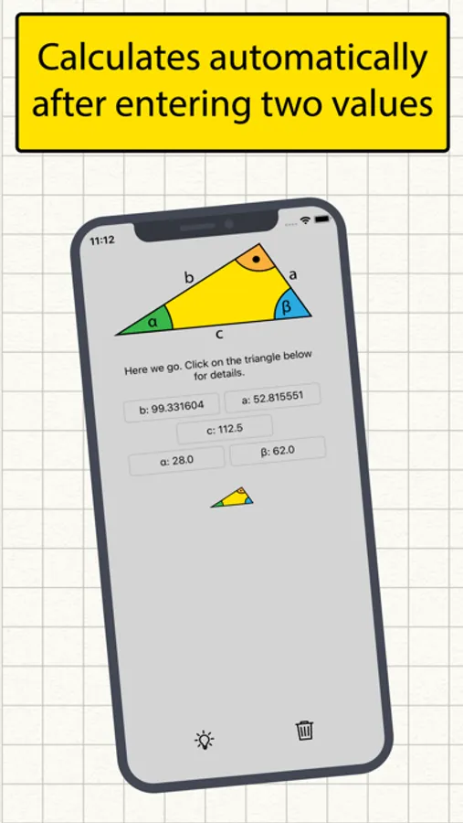 The app takes the decision for you. Just enter hypotenuse, cathetus, opposite, adjacent or an angle. With two values, all other values can be calculated at the right-angled triangle. As soon as two values are entered, the app calculates automatically.