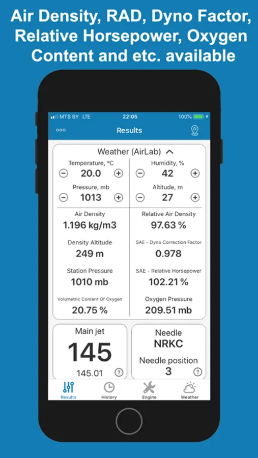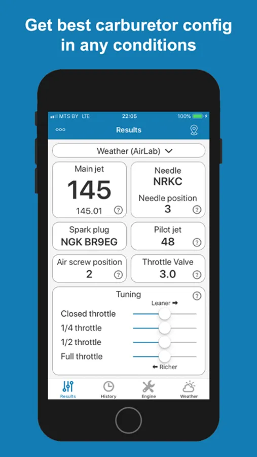 • Results: In this tab main jet, needle type, needle position, pilot jet, air screw position, throttle valve, spark plug are shown. These data are calculated depending on the weather conditions and the engine configuration given in the next tabs.