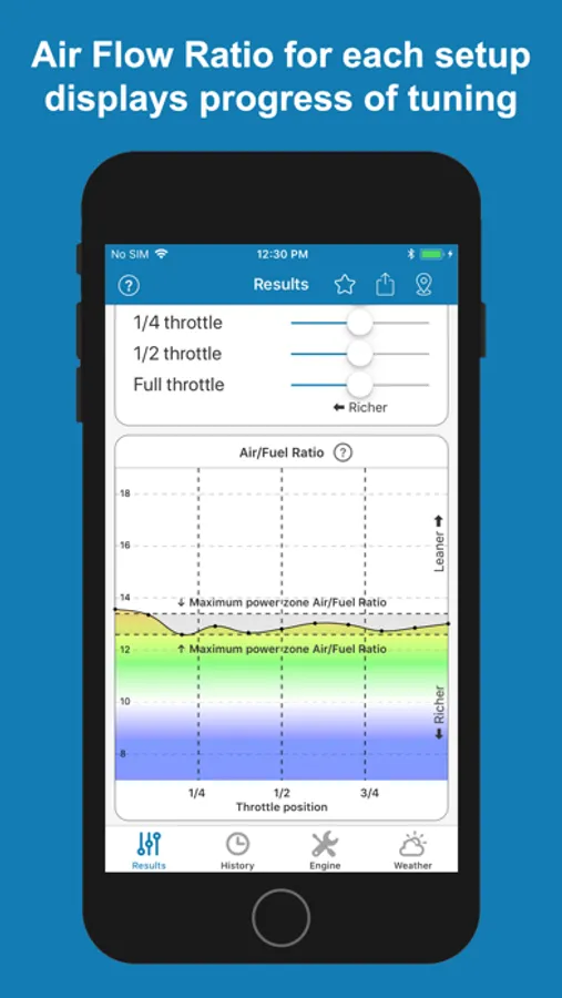 • History: This tab contains the history of all carburetor configurations. If you change the weather, or engine setup, or fine tuning, the new setup will be saved in history.