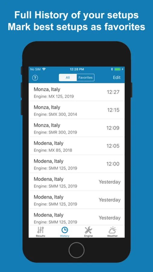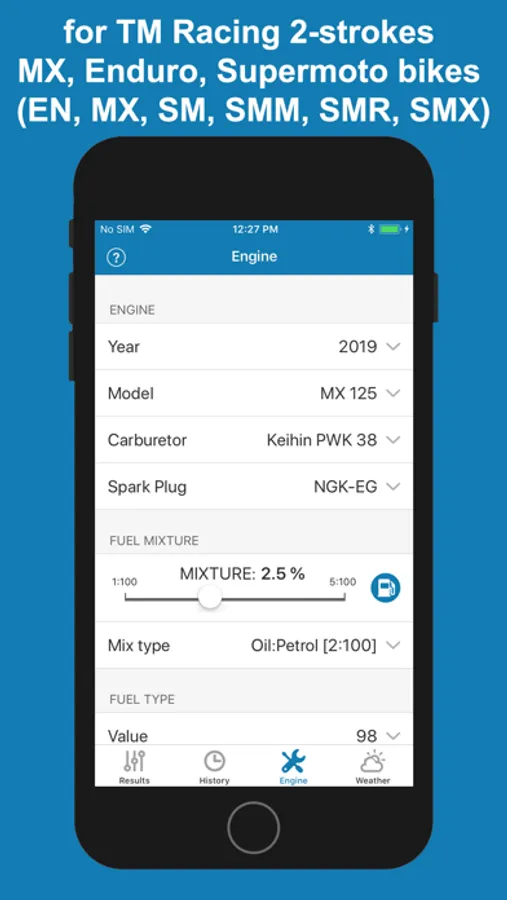 This app is using temperature, altitude, humidity, atmospheric pressure and your engine configuration for calculate optimal jetting (carburetor configuration) and spark plug to use for TM Racing 2-strokes Enduro, Motocross, Supermoto moto bikes.