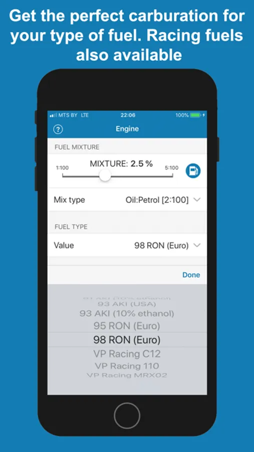 • Mix wizard to get the perfect mix ratio (fuel calculator)