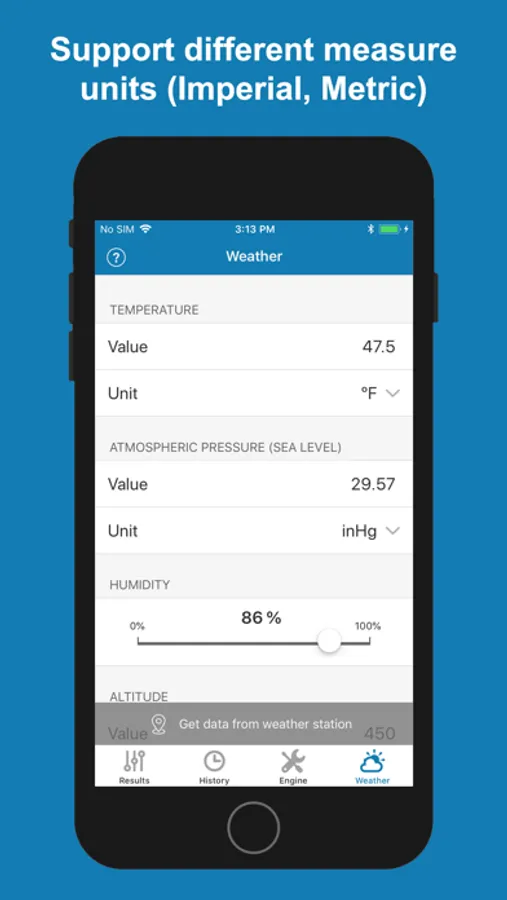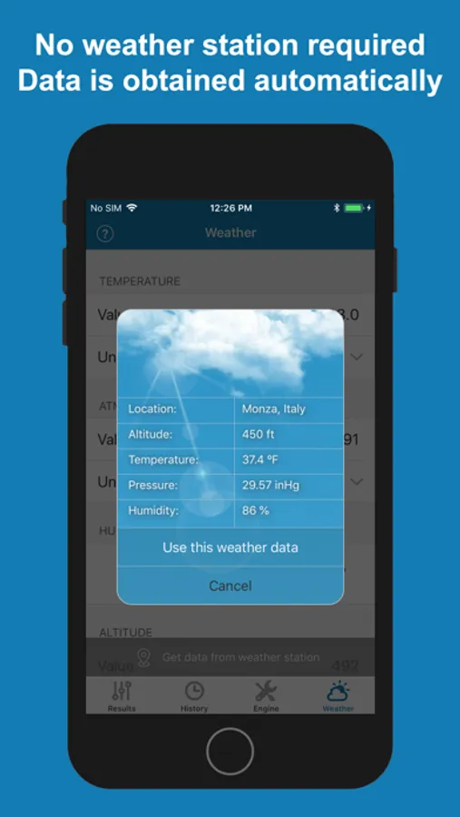 This app can obtain automatically the position and altitude to get the temperature, pressure and humidity from the nearest weather station thought internet. Internal barometer is used on supported devices for better precision. If more accuracy is needed, a portable weather station can also be used. Application can run without GPS, WiFi and internet, in this case user has to give the weather data manually.