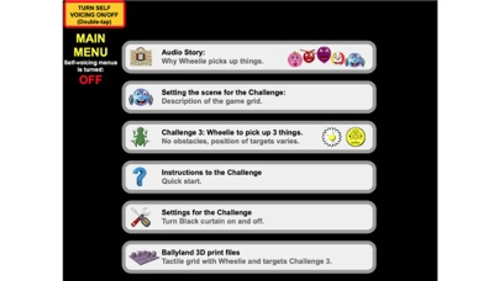 • Option to use Ballyland 3D printable tactile grid, moveable characters and objects for learning support (visit the website);