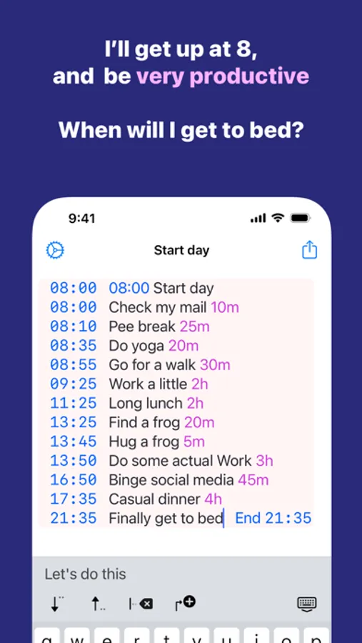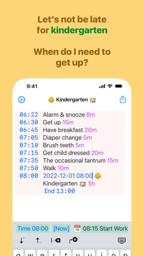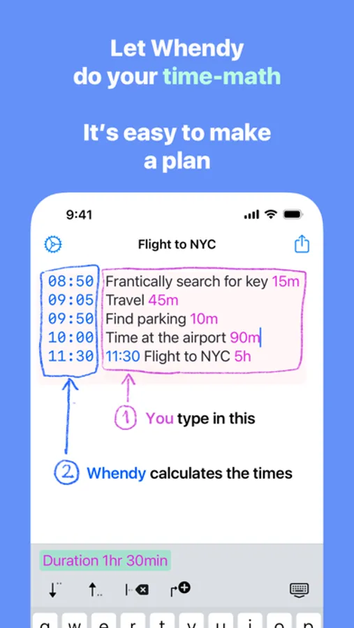 Do you sometimes get started too late? Ever arrived late to an appointment? Almost missed a flight? Or unnecessarily waited at the gate for hours? Sometimes you know when you need to be done, and you know how long each step takes. But it’s hard to do the math in your head and know when to start. Whendy makes it easy!