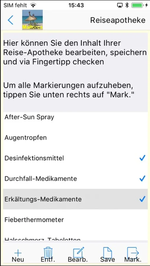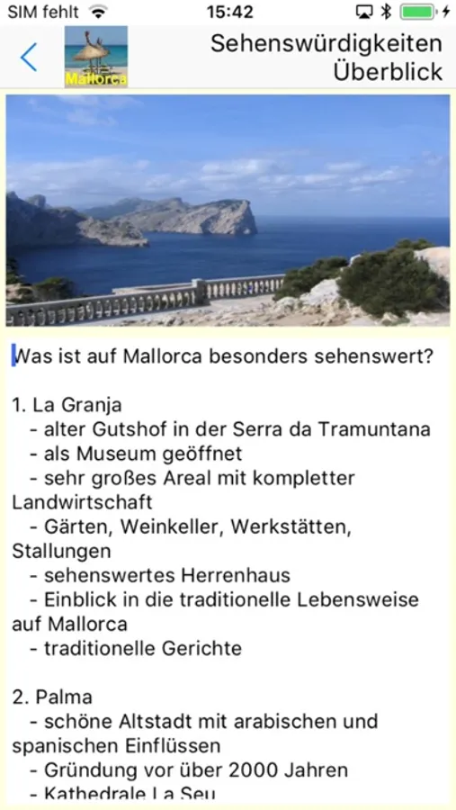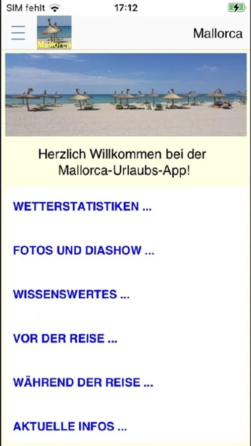 Die Mallorca-App und enthält u.a. Reise-Checklisten für Ihre Reiseapotheke und Ihr Urlaubsgepäck, welche Sie auch selber verfeinern und im nächsten Urlaub wieder benutzen können. Außerdem bietet sie eine kleine Diashow und eine Reistagebuch und Wetterstatistiken mit schönen Diagrammen z.B. zum Klimavergleich zweier Urlaubsort. Weiterhin ist eine kleine Diashow und eine Sammlung von relevanten Webseiten für die Region vorhanden und gibt Ihnen die Möglichkeit, alle Informationen, die für Ihren Aufenthalt auf Mallorca oder für Sie als Fan von Mallorca interessant sind, möglichst bequem im Internet abzurufen: