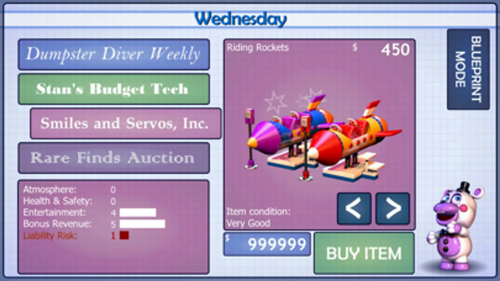 Browse our catalogs and purchase your first attractions and animatronics, customize your decorations, and above all make sure that all the equipment is working properly before opening the doors of your brand new Freddy Fazbear's Pizzeria!
