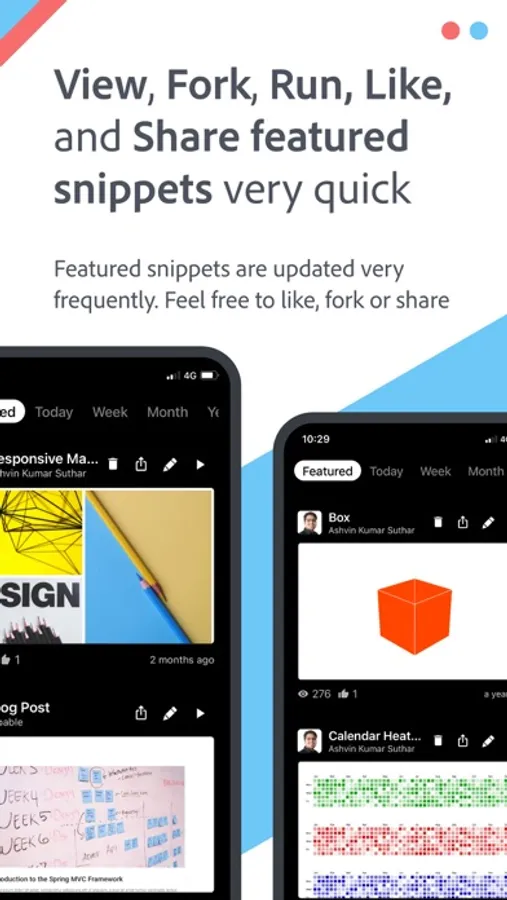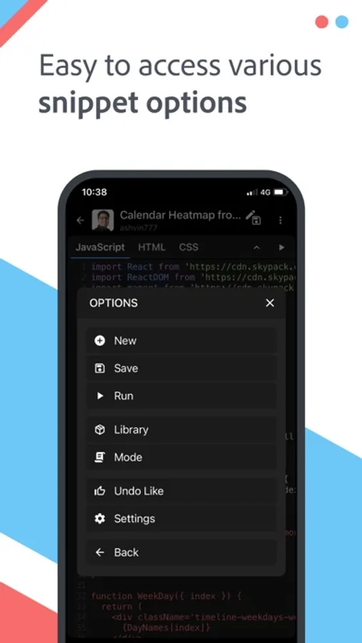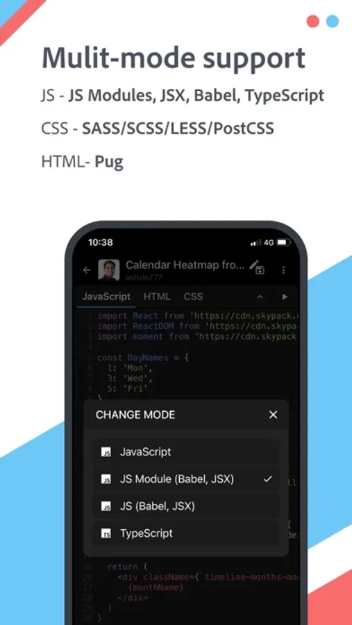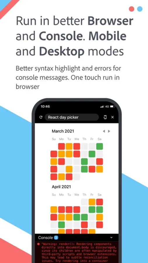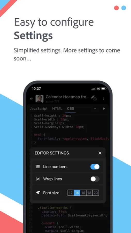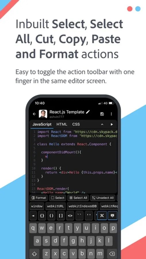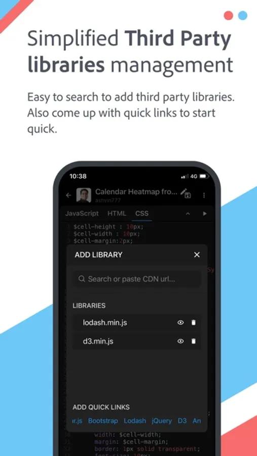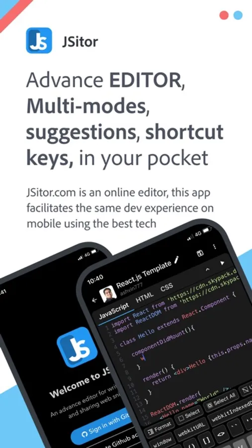 An advanced editor to write, test and share JavaScript, CSS, and HTML snippets in mobile phones and tablets. Below are the main features -