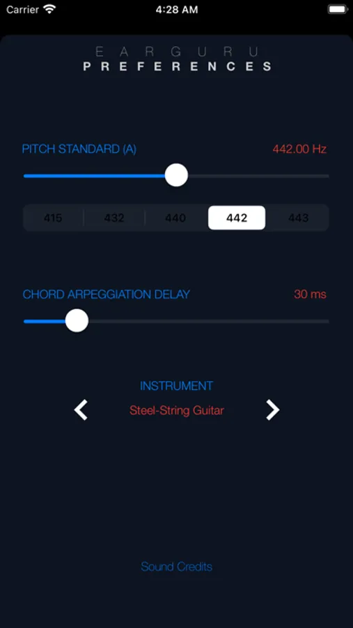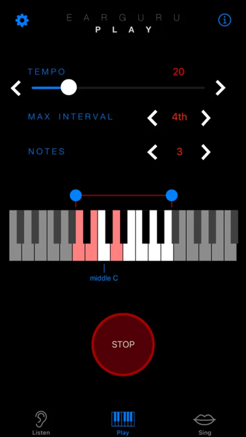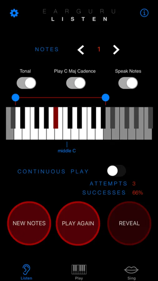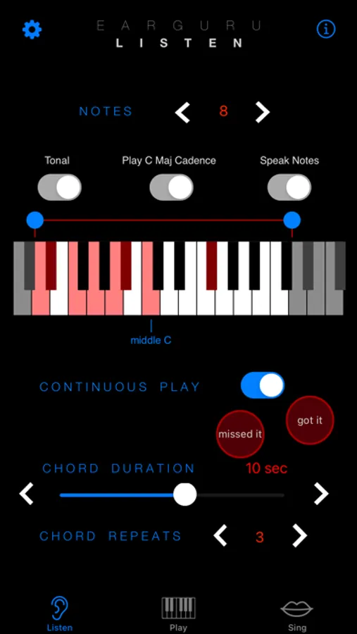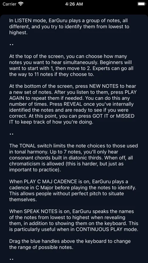 In LISTEN mode, EarGuru plays a group of notes, all different, and you try to identify them from lowest to highest. Beginners will want to start with 1, then move to 2. Experts can go all the way to 11 notes if they choose to.
