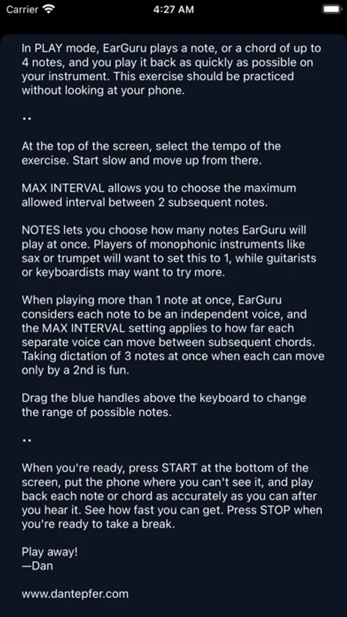 In PLAY mode, EarGuru plays a note, or a chord of up to 4 notes, and you play it back as quickly as possible on your instrument before it moves on to the next one.