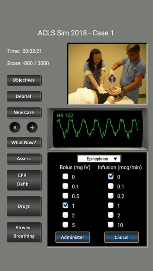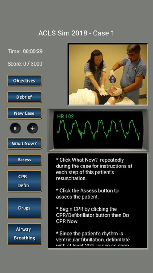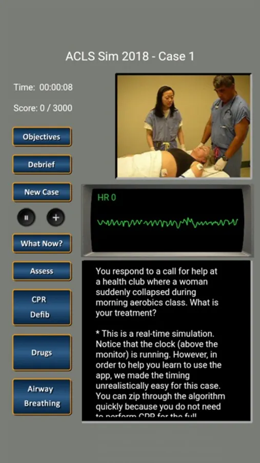 You must act quickly in these simulations or the patient's condition will deteriorate. Diagnose the ECG rhythm as the electrocardiogram waveform sweeps across the screen like on a real cardiac monitor. Assess and control the patient's airway and ventilation, administer CPR, defibrillation and medications to bring the patient back from cardiac arrest.