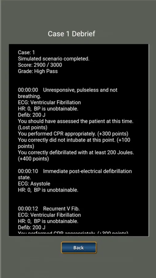 In addition to providing a graphical and dynamically changing simulation, the app provides a detailed record of your resuscitation, scores your performance, and provides detailed feedback on your management. Thus it is a complete learning environment.