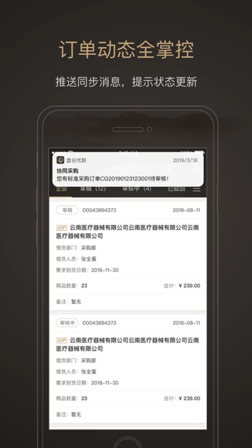 【线上订单】:支持线上完成订单制作以及采购合同制作。采用友好的录入接口,支持业务人员实现库快速录单下单,减少重复工作,提升工作效率。