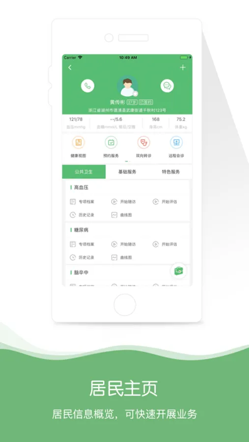 慢病管理:实现高血压、糖尿病专项管理、移动随访、年度评估。