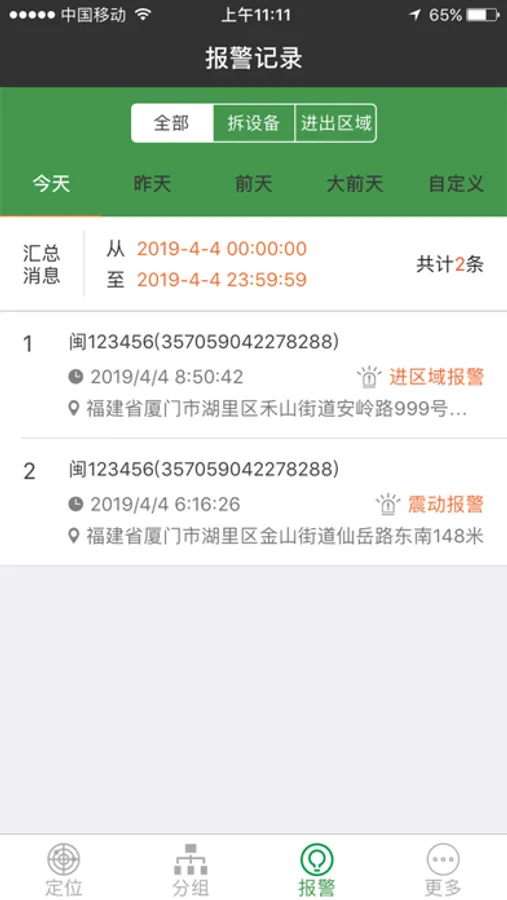 报警记录:支持对历史报警记录进行查询,包括单车报警记录和所有车的报警记录,为后期集中分析提供数据参考。可按照报警类型(全部、拆设备、进出区域)和报警时间联合查询报警记录。