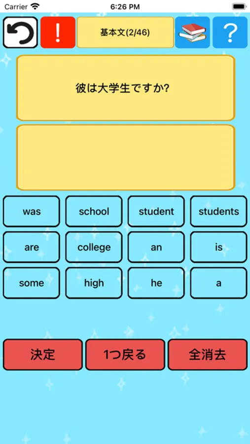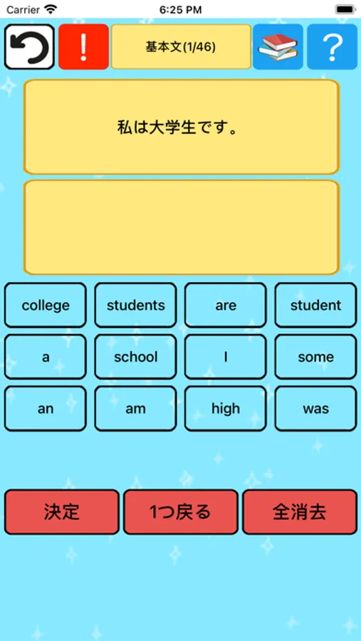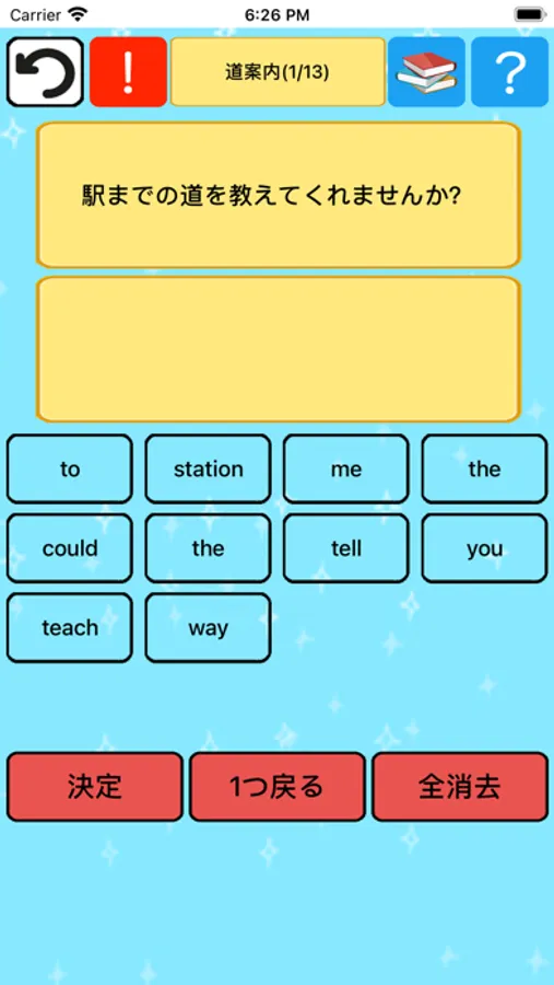 このアプリはタップ式の解答方法を採用しているので非常に簡単です。表示される日本語に対して、下の選択肢から文字をタップして解答をしていきましょう。入力ミスをした場合は消去ボタンを押すことで解答がクリアされ初期の状態に戻ります。決定ボタンを押すと合否判定され、合っていれば次の問題へ進むことができます。分からなければヒントをみてどんどん解いていきましょう。
