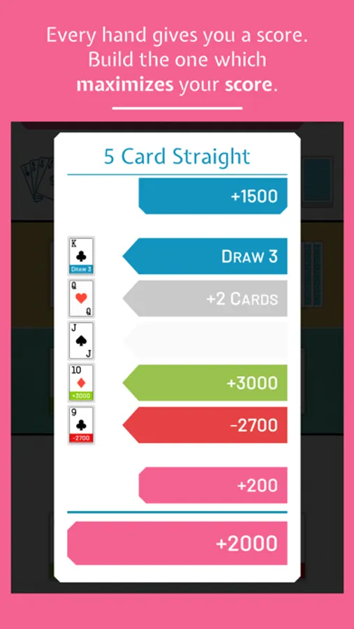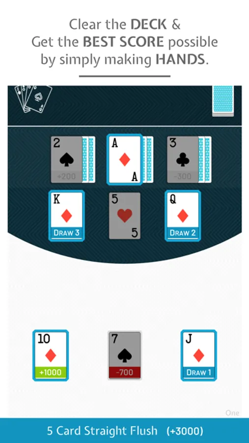 Keep building your score by making more and more hands. Keep going till you clear the entire deck or you can't make any more hands.