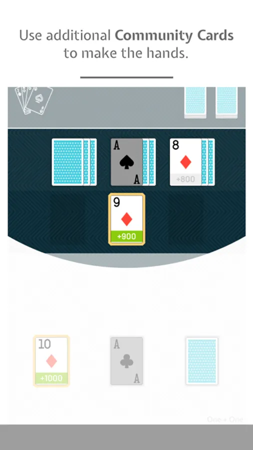 * Start the game with just 3 cards and use the 'Community Cards' specially dealt out for you in TWO SECTIONS to make the hands.